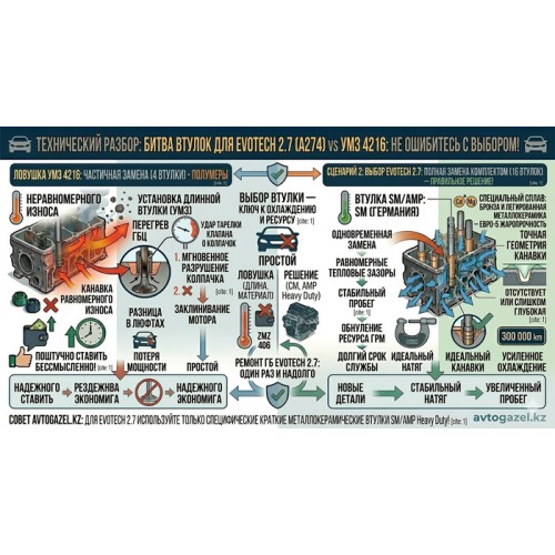 Двигатель Evotech 2.7 (A274) внешне похож на УМЗ, но его ГБЦ имеет принципиальные отличия. Главная ловушка для владельцев — попытка купить комплект направляющих от старого мотора 4216. Разберемся, почему для Evotech нужен свой, специфический набор.