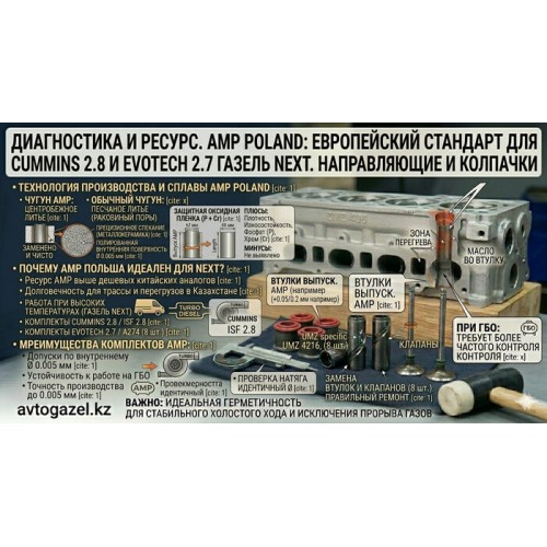 AMP использует метод центробежного литья для чугунных втулок и прецизионное спекание для металлокерамики. Это исключает наличие скрытых пор и раковин в металле. Для моторов Cummins 2.8 и Evotech 2.7 польский производитель предлагает втулки с повышенным содержанием фосфора и хрома, что создает на поверхности стержня клапана защитную оксидную пленку, минимизирующую износ.