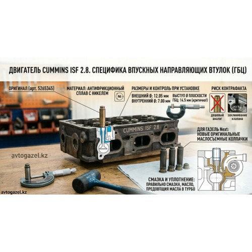 Двигатель Cummins ISF 2.8 — это технологичное сердце современной ГАЗели. В отличие от бензиновых собратьев, дизель работает с избыточным давлением наддува и колоссальными вибрационными нагрузками. Направляющая впускного клапана (арт. 5265345) здесь выполняет роль не только опоры, но и важнейшего уплотнительного узла, предотвращающего прорыв газов в картер.