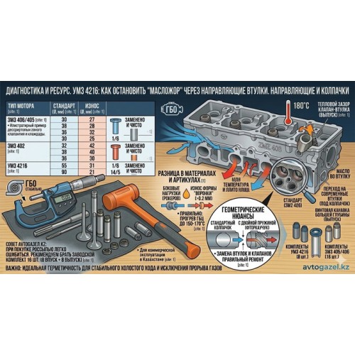 Двигатель УМЗ 4216 на ГАЗелях Бизнес часто критикуют за повышенный расход масла. Если замена поршневых колец не дает результата, а свечи зажигания покрыты рыхлым нагаром, причина в 90% случаев кроется в критическом износе направляющих втулок впускных клапанов.