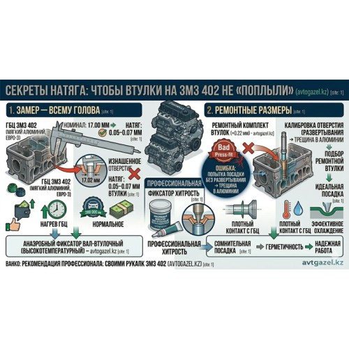 На avtogazel.kz всегда в наличии ремонтные комплекты втулок с увеличенным наружным диаметром (+0.22 мм). Это спасение для старых ГБЦ.
