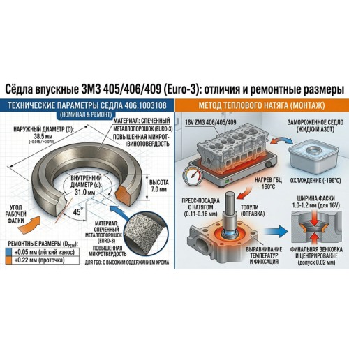 В отличие от 402-го мотора, сёдла 406-й серии работают с гидрокомпенсаторами. Это означает, что малейший износ фаски или её деформация приводит к изменению рабочего диапазона компенсатора. Чтобы избежать этого, для изготовления 406.1003108 применяется специальный легированный сплав с высоким содержанием хрома.