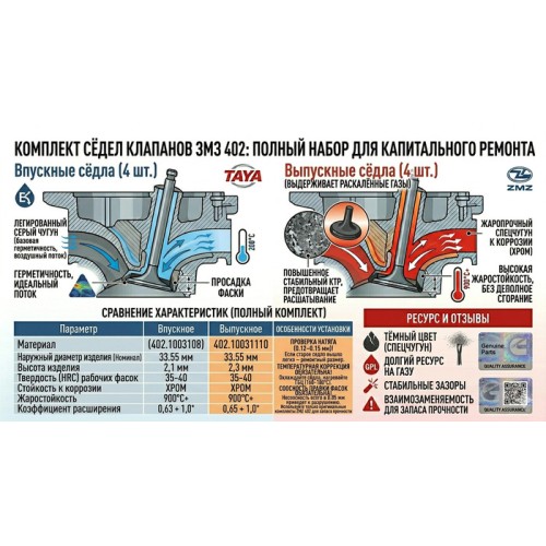 В магазине avtogazel.kz вы можете приобрести полные комплекты сёдел (8 штук) для ЗМЗ 402 от ведущих производителей, обеспечивающие идеальную совместимость и долговечность вашего мотора.